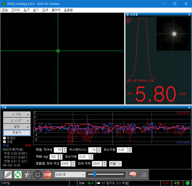위의 스크린 캡쳐는 대표적인 가이드 프로그램인 PHD2 Guiding을 이용하여,