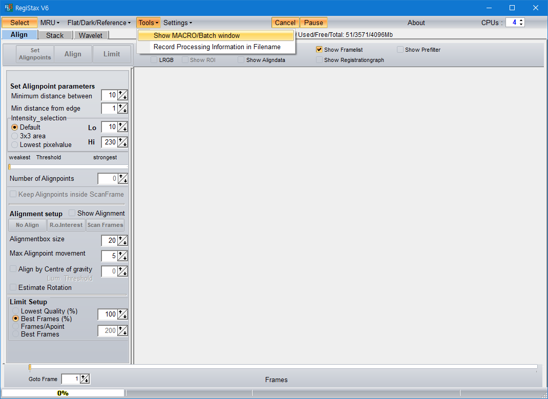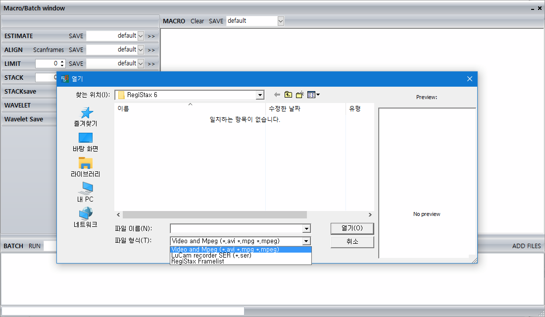 Registax 6에는 동일한 작업을 자동으로 반복수행할 수 있는 Batch mode 기능이 있다.