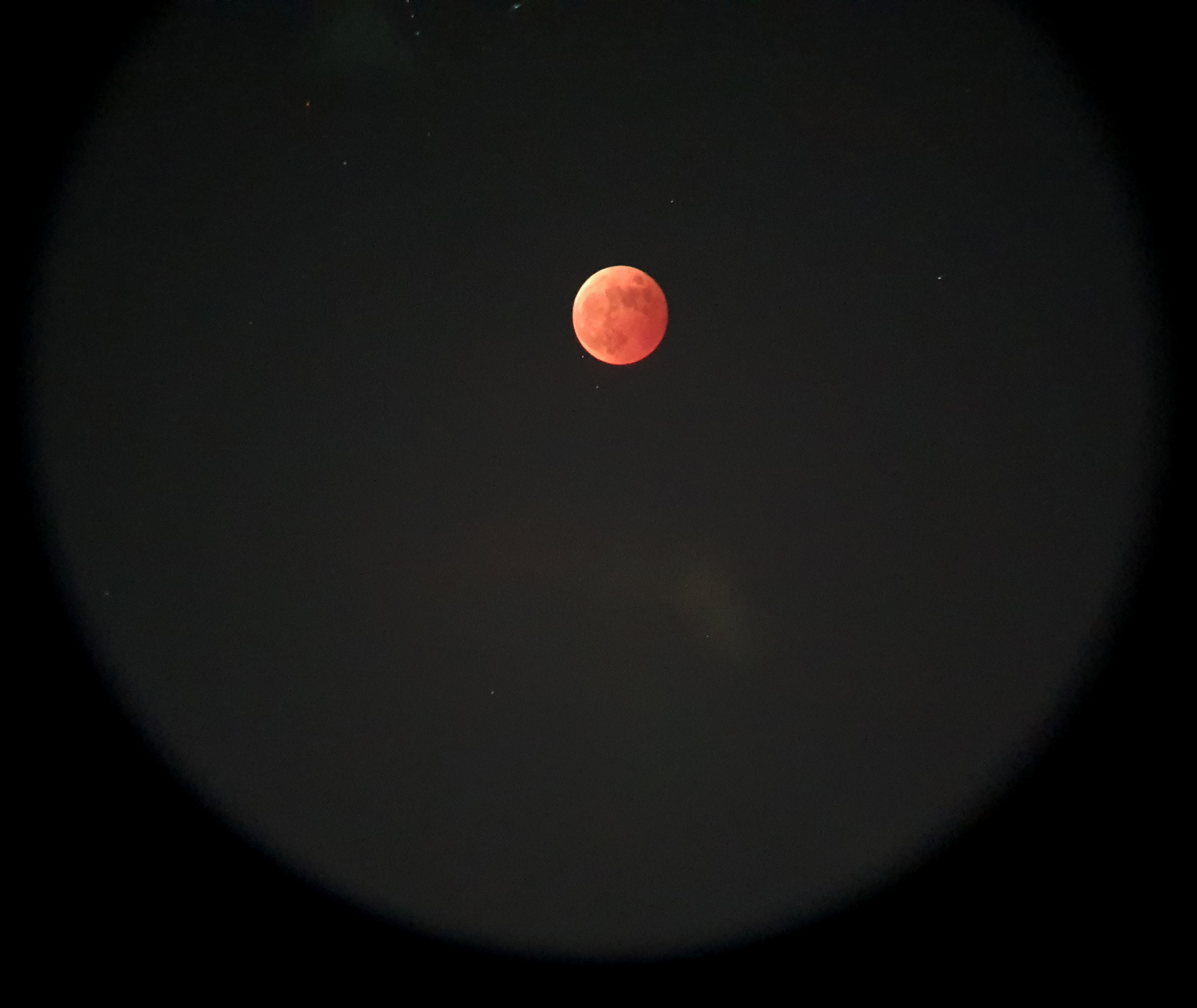 이미 개기식 중인 붉은 달과, 달의 좌측 아래(8시 방향)에서 달을 향해 달려가는 천왕성이 보였다.